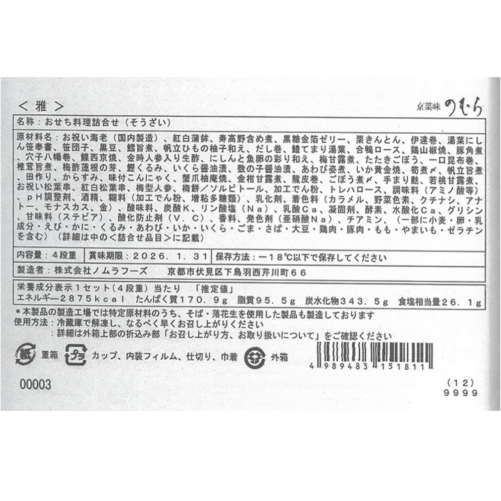紅白蒲鉾(4切)・椎茸旨煮(4個)・鱈旨煮(55g)・黒豆(55g)・梅餅(1個)・からすみ(20g)・栗きんとん(70g)・鰹くるみ(35g)・蟹爪柚庵焼(2個)・鰈西京焼(3切)・若桃甘露煮(2個)