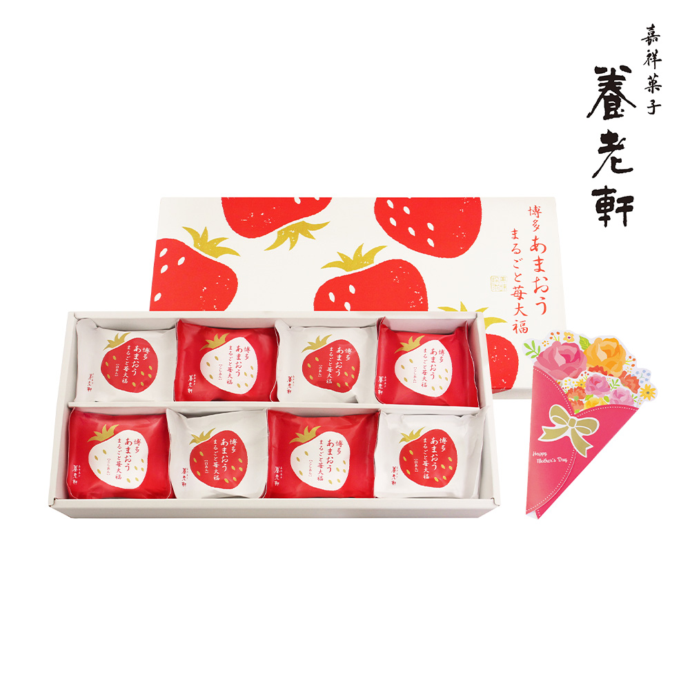 - 福岡の苺農家さんが愛情たっぷりに育てたMサイズの博多あまおうを、まるごと1玉使用した紅白2種類の苺大福。一口頬張ると、あまおうの酸味と、あんこの上品な甘みがお口の中に広がります。半解凍で美味しくお召し上がりいただけます。フルーツ大福で有名な京都養老軒監修。母の日のメッセージをつけてお届けいたします。