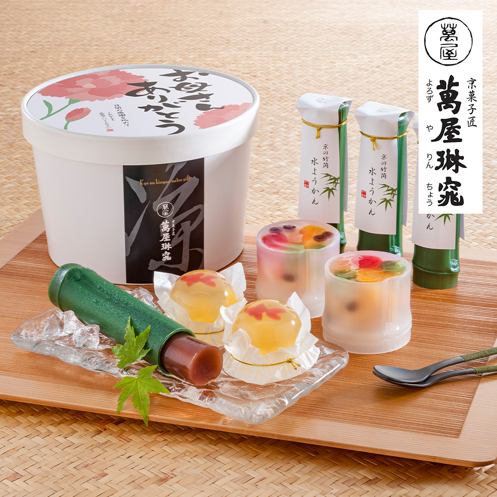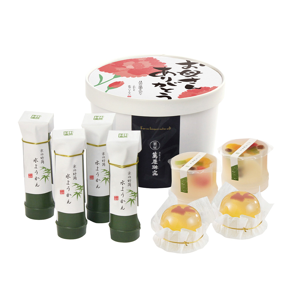 - 感謝の気持ちが伝わる可愛いパッケージに、涼しげな金魚が泳ぐゼリー、カラフルなみつ豆ゼリー、口どけなめらかな竹筒入り水ようかんを詰合せました。※竹筒はプラスチック製です。