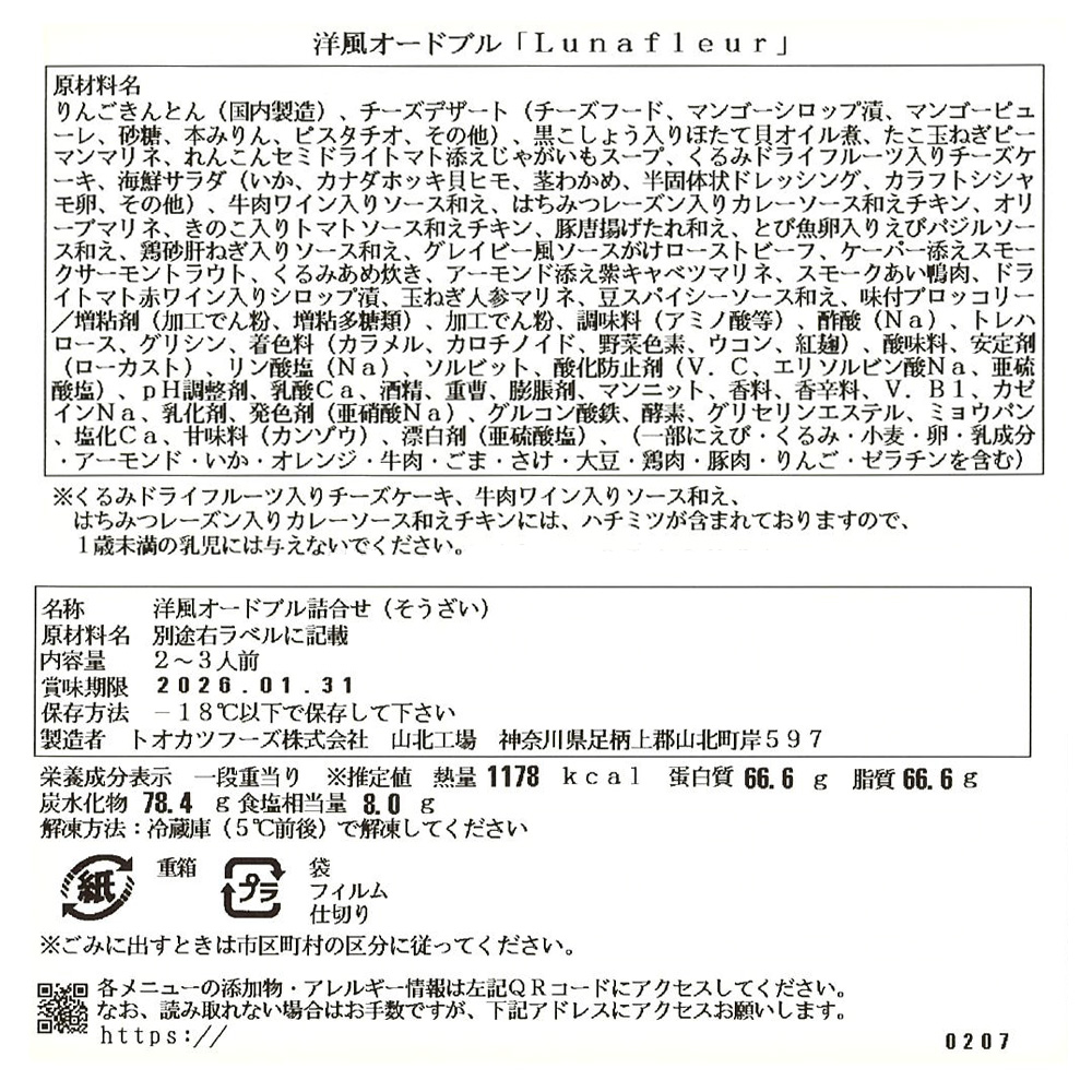 ドライフルーツのフロマージュ(4ヶ)・ハニーカレーチキン(30g)・真蛸のイタリアンマリネ(35g)・帆立のコンフィ(2ヶ)・ドライトマトのシロップ煮(3ヶ)・ブロッコリーのコンソメ煮(10g)・2色オリーブ(30g)・トラウトスモークサーモンローズ(1ヶ)・オニオンマリネ(10g)・牛肉の赤ワイン煮込み(30g)・林檎とさつま芋のスイートペースト(40g)・砂肝の柚子風味ねぎだれ和え(25g)・海老ととびこのバジルソース(25g)・ローストビーフ グレービーソースがけ(3ヶ)・チーズデザート マンゴーソース(1ヶ)・紅茶あい鴨パストラミ(3ヶ)・スパイシーミックスビーンズ(10g)・紫キャベツのピクルス(20g)・豚ヒレ肉の黒胡椒ソース(30g)・海鮮彩りサラダ(30g)・クルミの飴炊き(22g)・鶏肉のトマトソース(30g)・食べるじゃがいもスープ(1ヶ)アレルゲン えび・くるみ・小麦・卵・乳成分・オレンジ・牛肉・ごま・さけ・大豆・鶏肉・豚肉・りんご・ゼラチン・アーモンド・いか 賞味期限 2026/1/31(冷凍保管にて) 保存方法 冷凍(-18℃以下) サイズ 重箱サイズ(外寸):約220mm×270mm×68mm お届けについて 【お届け日】