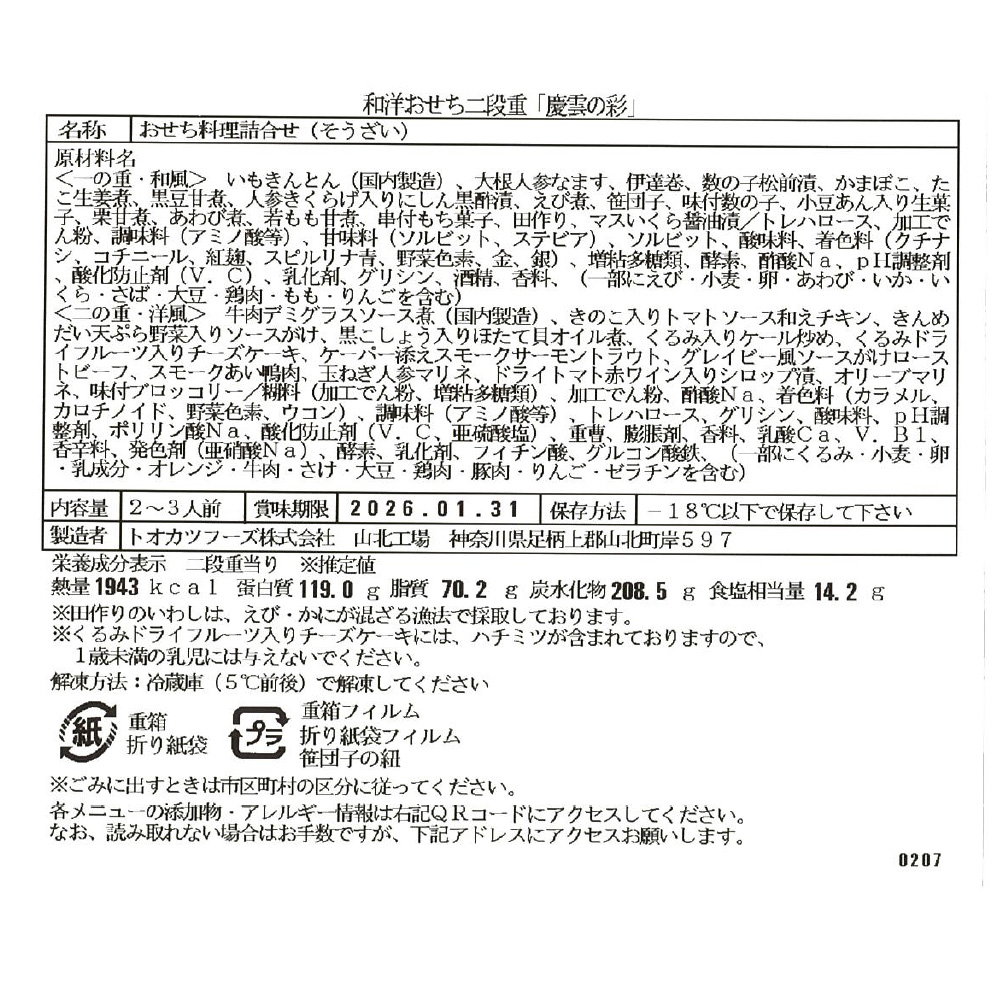 黒毛和牛のデミグラスソース煮込み(60g)・ブロッコリーのコンソメ煮(10g)・金目鯛のラビゴットソース(45g)・帆立のコンフィ(3ヶ)・グリーンオリーブのマリネ(1ヶ)・ブラックオリーブのマリネ(1ヶ)・鶏肉のトマトソース(60g)・トラウトスモークサーモンローズ(1ヶ(4枚))・オニオンマリネ(25g)・ローストビーフ グレービーソースがけ(3ヶ)・ドライフルーツのフロマージュ(4ヶ)・ドライトマトのシロップ煮(3ヶ)・ケールとクルミのガーリック炒め(35g)・紅茶あい鴨パストラミ(4ヶ)アレルゲン えび・小麦・卵・あわび・いか・いくら・さば・大豆・鶏肉・もも・りんご・くるみ・乳成分・オレンジ・牛肉・さけ・豚肉・ゼラチン 賞味期限 2026/1/31(冷凍保管にて) 保存方法 冷凍(-18℃以下) サイズ 重箱サイズ(外寸):約190mm×190mm×46mm×2段 お届けについて 【お届け日】