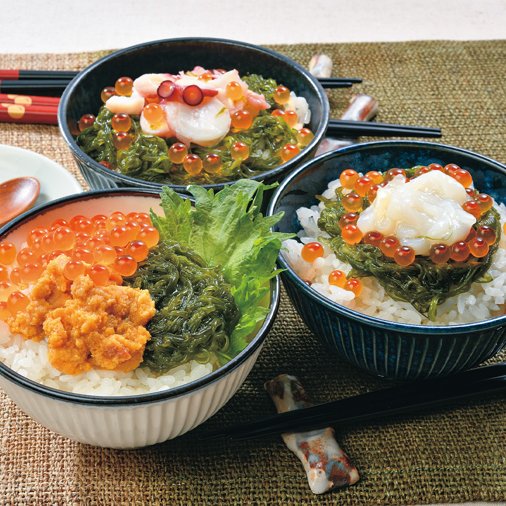 ご自宅等、宮古から遠く離れたところでも食べられるようになりました。内容量 イカ・タコ・ウニ 各80g×1本 原材料名 【イカ】イカ(岩手県産)、めかぶ(三陸産)、醤油漬けいくら(鮭卵(国産)、水あめ、醤油、その他)、水あめ、アミノ酸液、清酒、醤油、カツオエキス、たん白加水分解物、酵母エキス/酸味料、増粘多糖類、調味料(アミノ酸等)、トレハロース(一部に小麦・大豆・いか・いくらを含む)