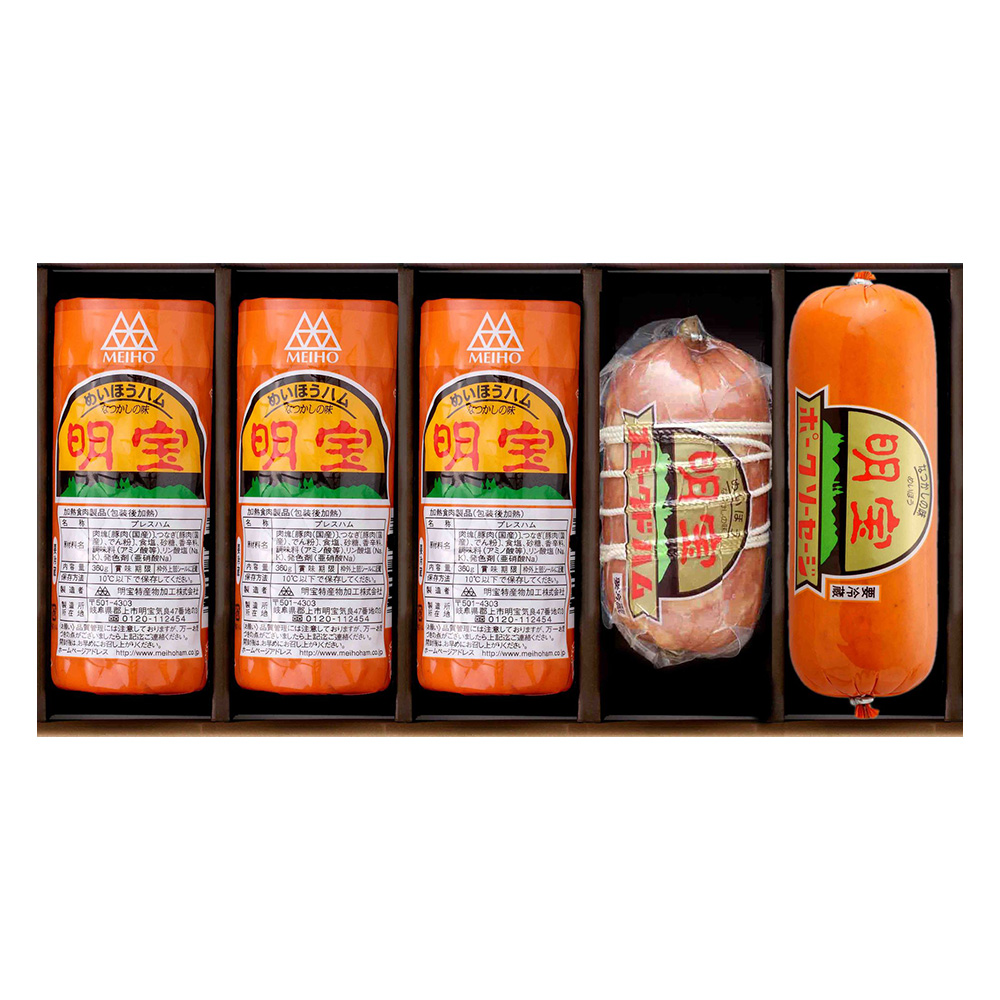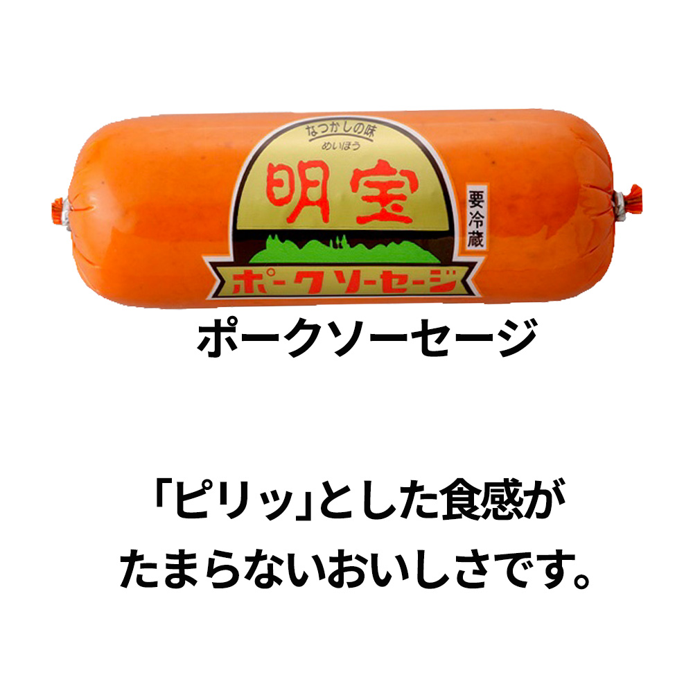 「ピリッ」とした食感がたまらないおいしさの「ポークソーセージ」の5本セットです。内容量 明宝ハム:360g×3本、スモークドハム:280g×1本、ポークソーセージ:300g×1本 原材料名 明宝ハム:豚肉(国産)、てんぷん、食塩、砂糖、香辛料、調味料(アミノ酸等)、リン酸塩(Na、K)、発色剤(亜硫酸Na)