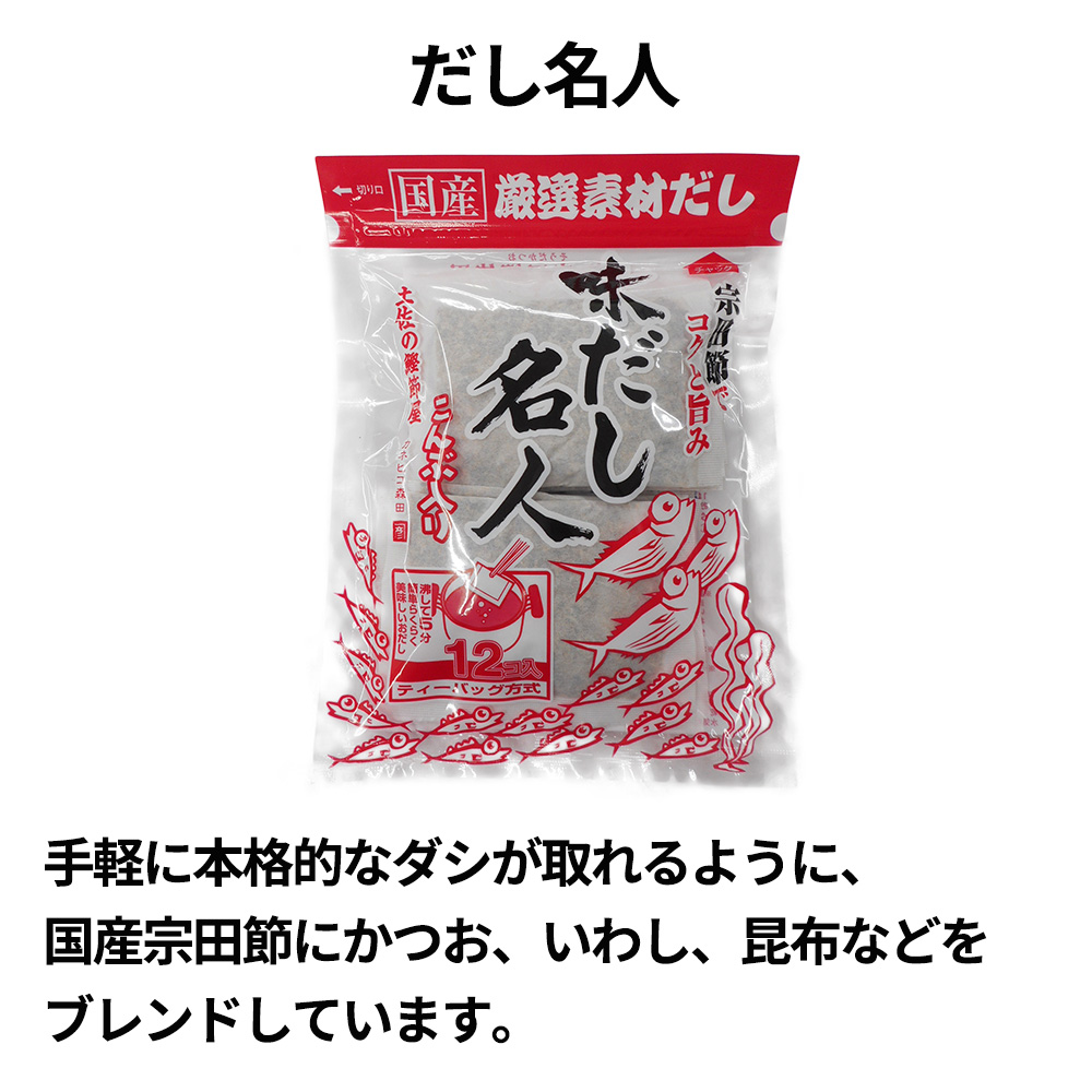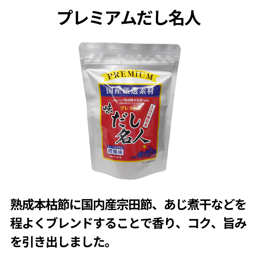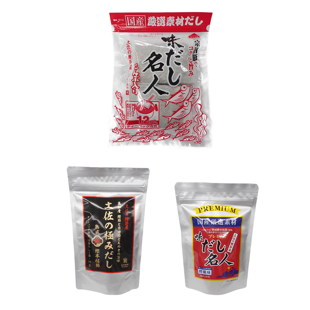 国内産の宗田節にかつお、いわし、昆布などをブレンドする事により風味がありコクと旨みが程よくマッチしています。手軽に本格的なプロのダシをお楽しみいただけます。内容量 土佐の極みだし126グラム×1、プレミアムだし名人170グラム×2、だし名人142グラム×2 原材料名 【土佐の極みだし】かつおのかれぶし(高知県産)、そうだがつおのふし(高知県産)、乾燥えのき茸(高知県産)