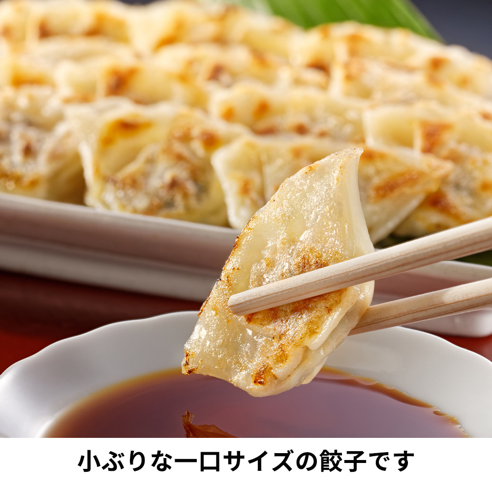 - 豚肉とキャベツに、にら・にんにく・生姜を加え、黒胡椒で味付けし薄皮で包んだ一口サイズの餃子です。