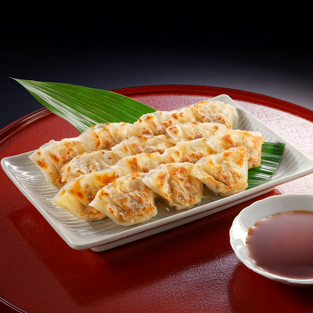 皮(小麦粉、植物油脂、食塩)(国内製造)、野菜(キャベツ(国産)、玉ねぎ、ニラ)、豚肉(鹿児島県産)、豚脂、しょうがペースト、にんにくペースト、醤油、オイスターソース、味付塩こしょう、ごま油、小麦粉、かつおだし/加工でん粉、酒精、調味料(アミノ酸等)、酸味料、増粘剤(加工でん粉)、着色料(カラメル)、(一部に小麦・大豆・豚肉・ごまを含む)