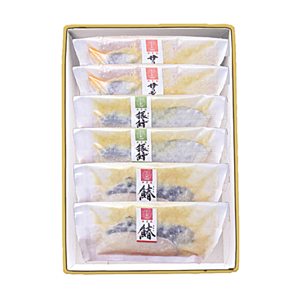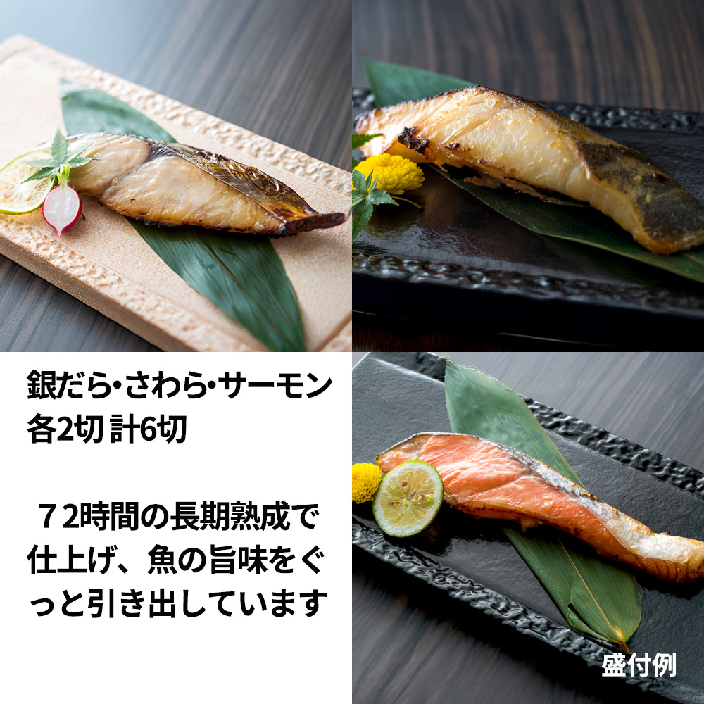 銀だら・さわら・サーモン3種のお魚を各2切ずつセットにしています。内容量 銀だら:90g×2切