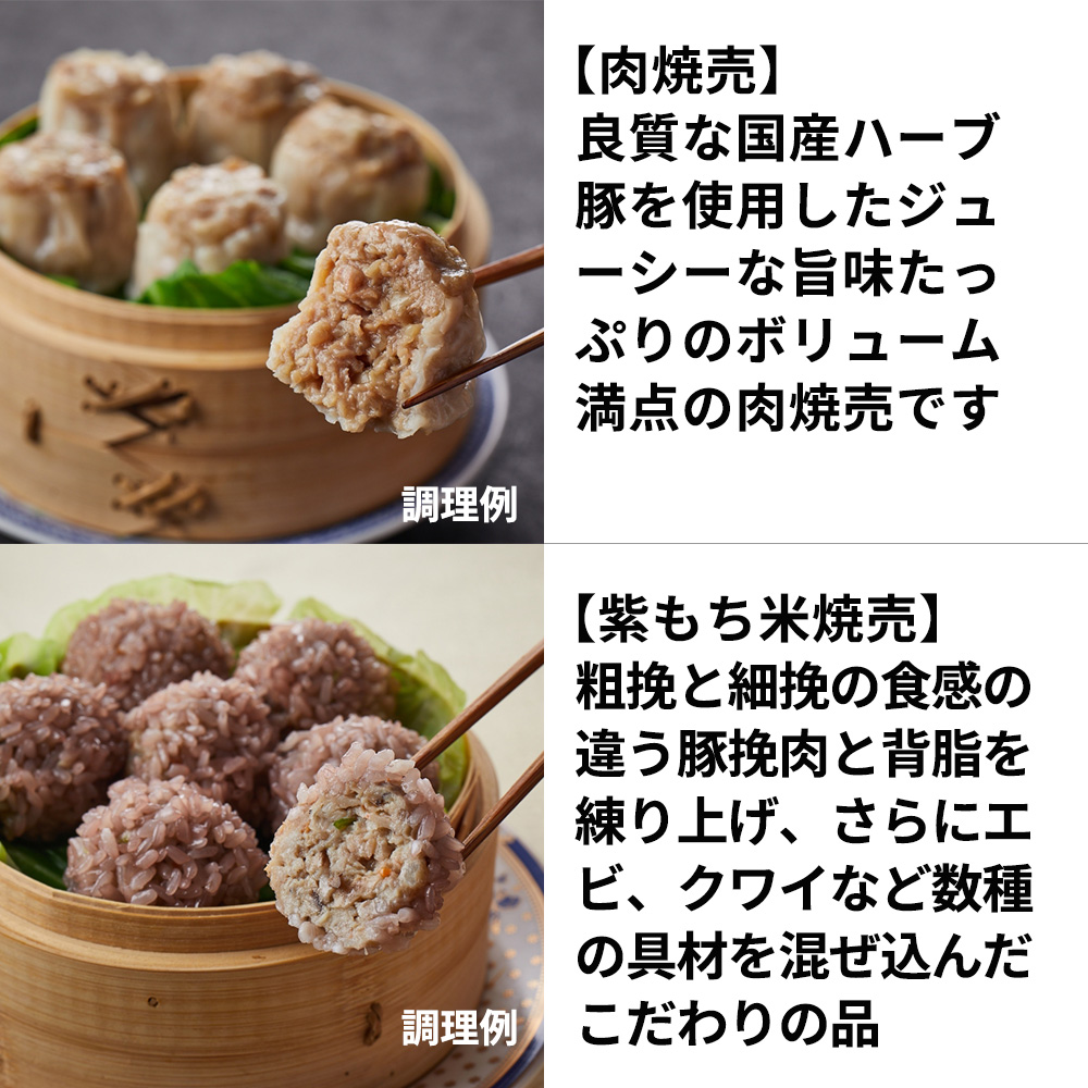 【紫もち米焼売】豚肉(国産)、糯米(国産)、野菜(クワイ(中国産)、葱、人参)、エビ(タイ産)、椎茸(中国産)、砂糖、片栗粉、卵白、食塩、ごま油、葱油、チキンエキス調味料、香辛料、酵母エキス/着色料(黒米)、(一部にえび・卵・ごま・大豆・鶏肉・豚肉を含む)