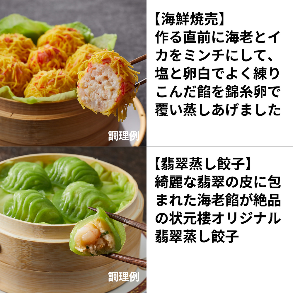 ニラの香りを生かしつつ、海老餡を引き立てる味わいに仕上がっている、色味と風味と旨味が揃った、状元樓オリジナルの点心です。
