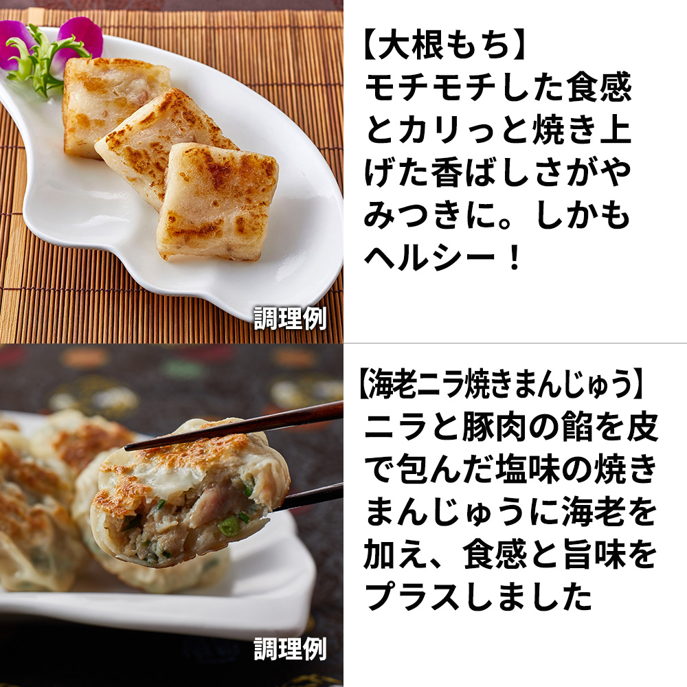 【海老ニラ焼き饅頭・大根もち・ハーブ豚餃子】