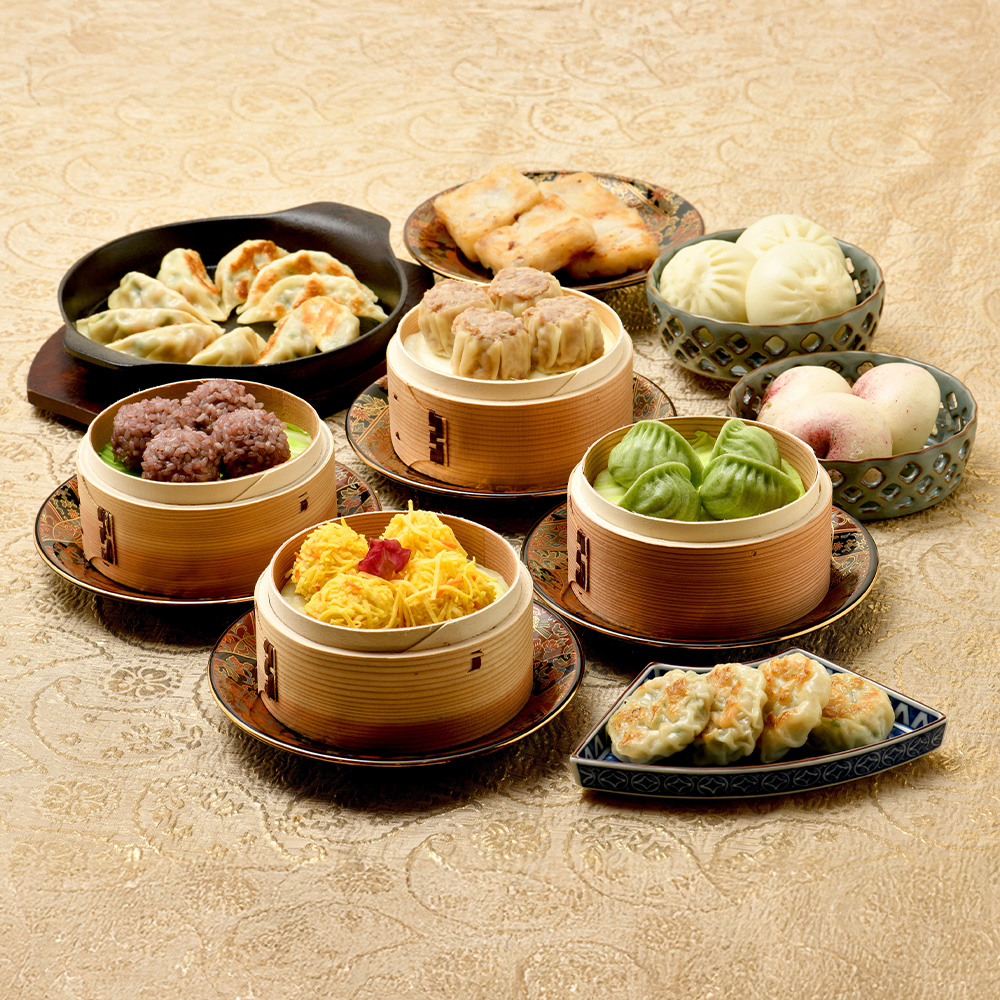 【肉焼売・紫もち米焼売・海鮮団子・翡翠蒸し餃子・ミニ肉饅頭・ミニ桃饅頭】