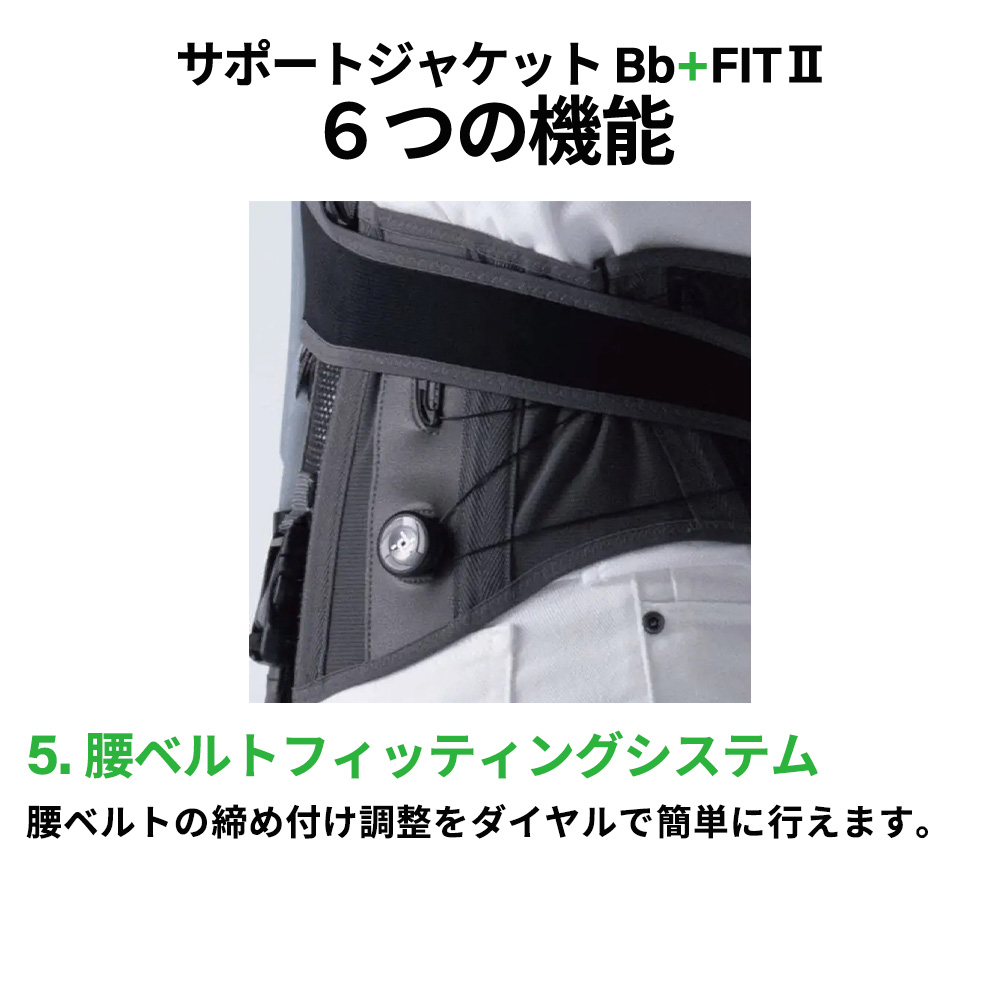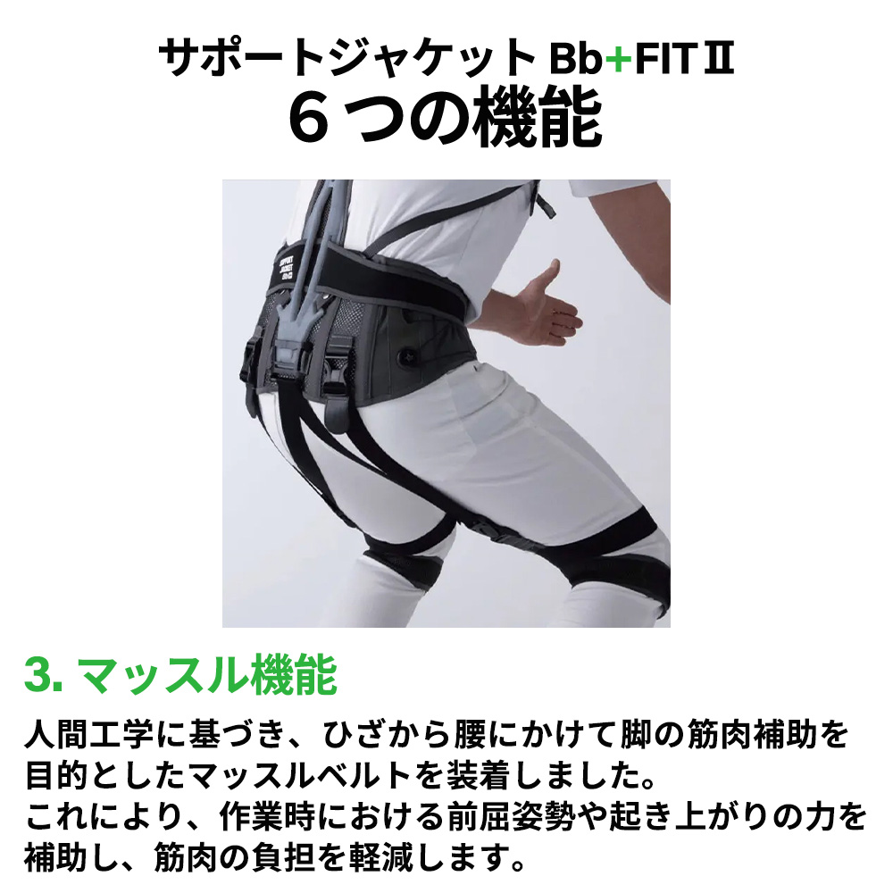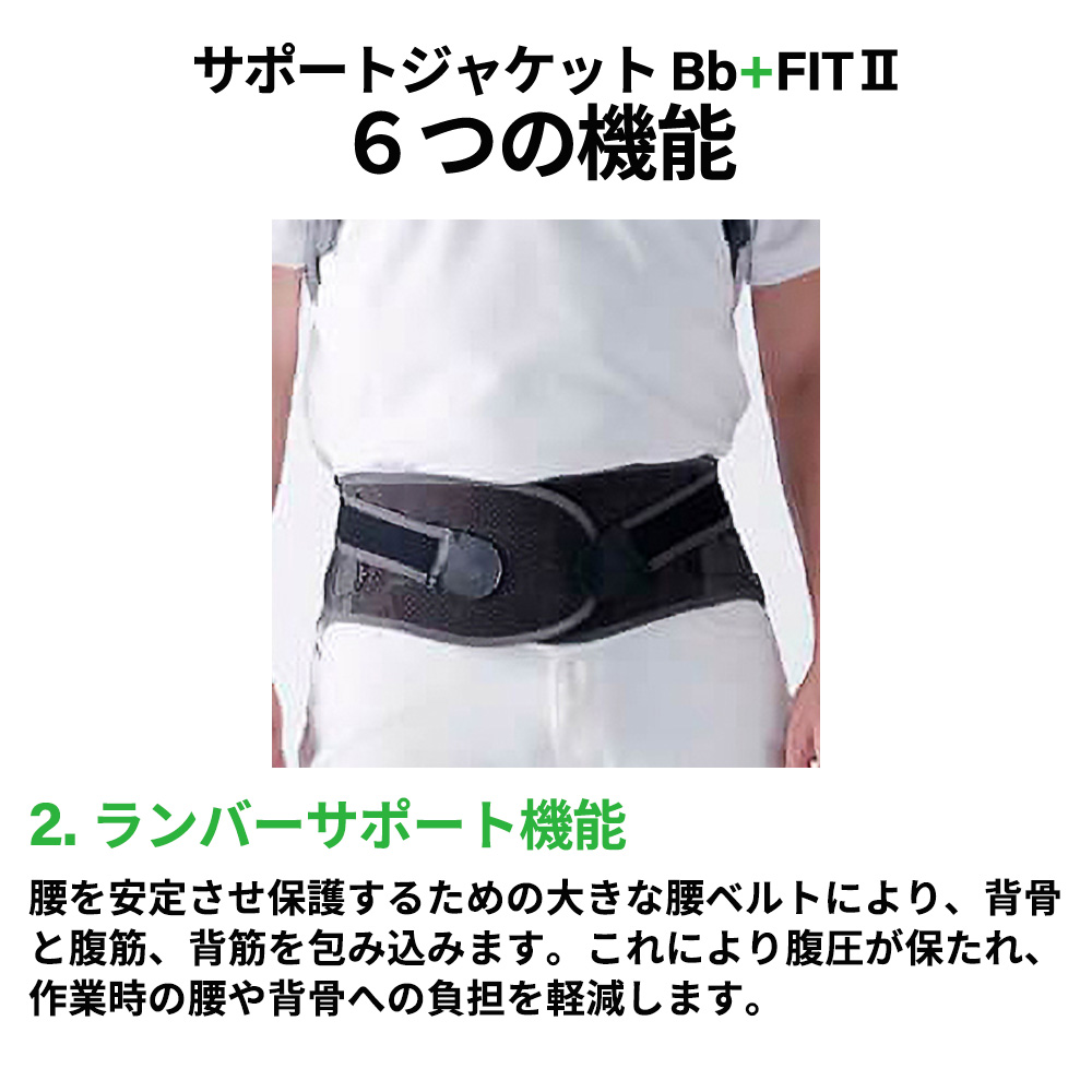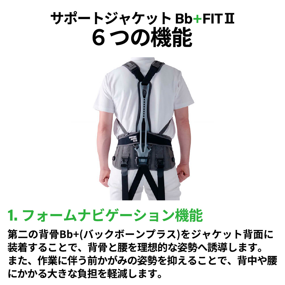 - 第二の背骨Bb+(バックボーンプラス)をジャケット背面に装着することで、背骨と腰を理想的な姿勢へ誘導します。作業に伴う前かがみの姿勢を抑えることで、背中や腰にかかる大きな負担を軽減します。