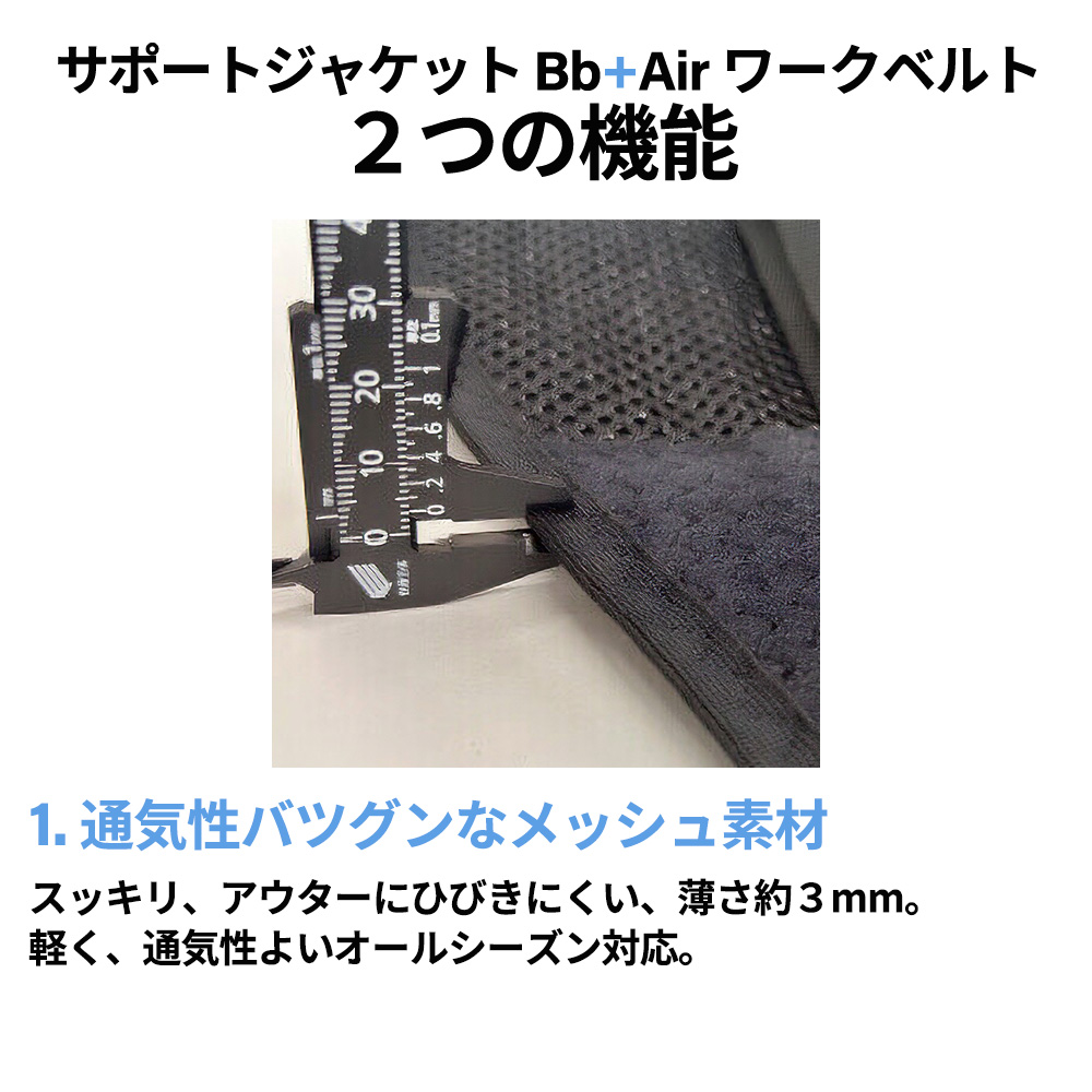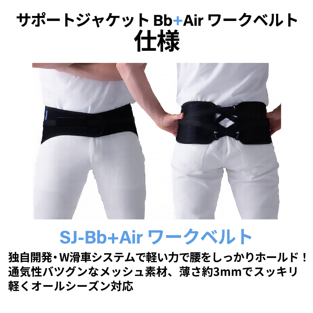 - 単品でも使用できる腰ベルト“WORK BELT”は、Bb+Airとの併用によりさらなる効果を発揮できます。少ない力で腰ベルトをしっかり締める機構により、誰でもカンタンに腹圧を上げることが可能です。